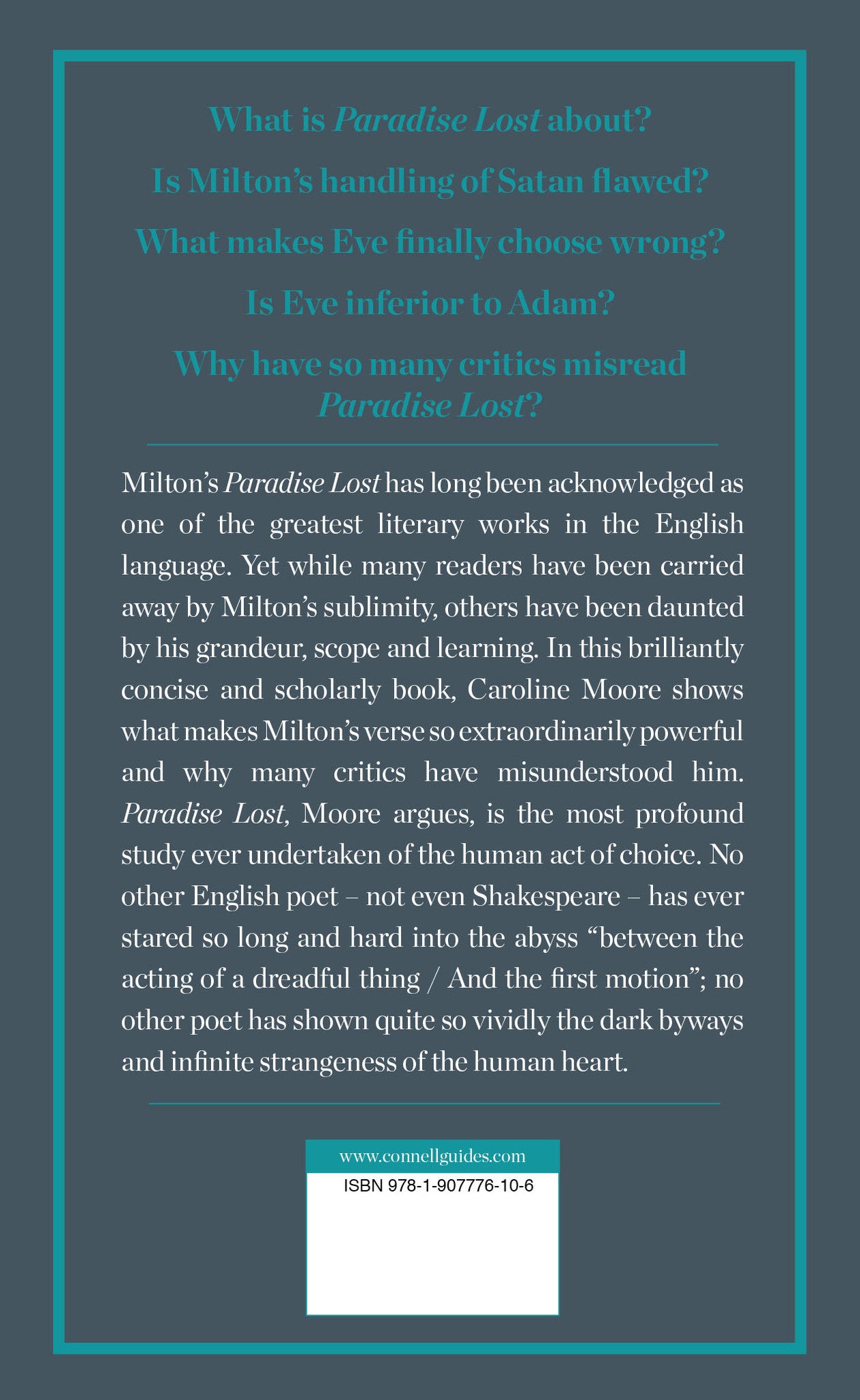 Milton's Paradise Lost has long been acknowledged as one of the greatest literary works in the English language. Yet while many readers have been carried away by Milton's sublimity, others have been daunted by his grandeur, scope and learning. In this brilliantly concise and scholarly book, Caroline Moore shows what makes Milton's verse so extraordinarily powerful and why many critics have misunderstood him. Paradise Lost, Moore argues, is the most profound study ever undertaken of the human act of choice. No other English poet - not even Shakespeare - has ever stared so long and hard into the abyss "between the acting of a dreadful thing / And the first motion"; no other poet has shown quite so vividly the dark byways and infinite strangeness of the human heart.